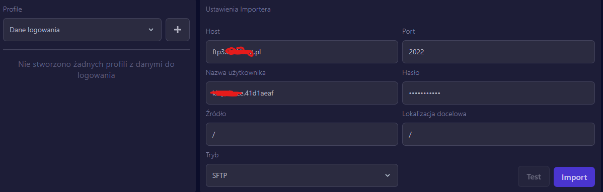 Wprowadź dane dostępowe do SFTP lub FTP z hostingu, z którego chcesz przenieść serwer.